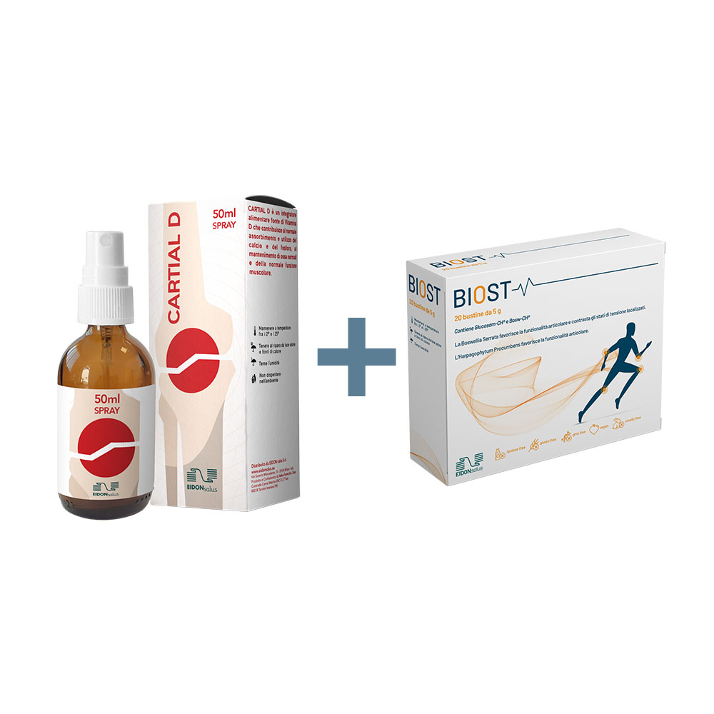 Assumere Cartial D 11 puff al mattino e 11 alla sera e tenere sotto la lingua per 30/60 secondi, per favorire l’assorbimento sublinguale e il Biost 1 volta al dì, sempre alla stessa ora, sciogliendo il contenuto della bustina in un bicchiere d’acqua, come da consigli d’uso riportati sulla confezione.